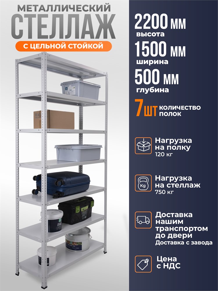 Металлический стеллаж повышенной прочности серии mr с цельной стойкой. Высота стеллажа 2200 мм, ширина - 1500 мм, глубина - 500 мм. В комплекте 7 полок. Предназначен для хранения различных вещей, товаров и материалов. Максимальная нагрузка на одну полку составляет 120 кг, а общая грузоподъемность стеллажа — до 750 кг, что обеспечивает устойчивость и долговечность конструкции. Регулируемый шаг крепления полок 25 мм позволяет легко адаптировать высоту полок под нужды хранения и оптимально использовать пространство. Идеальное решение для дома, склада, магазинов, гаражей и производственных помещений.
